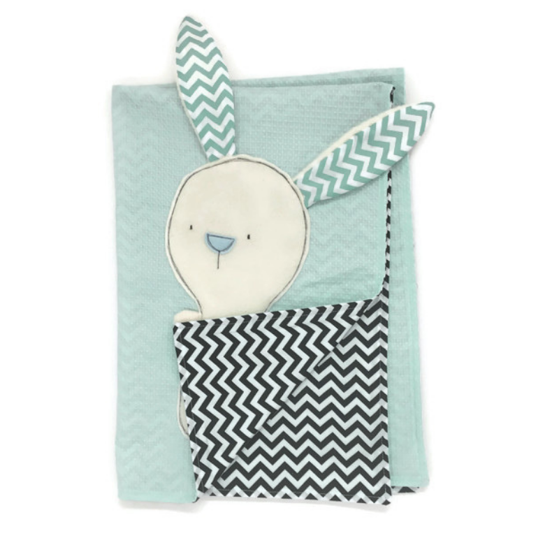 על השמיכה יש אפליקציה של שחר, אזני הארנב אינן תפורות לשמיכה ולכן ניתן לשחק איתן ולמולל אותן ביד (מתכון מנצח לתינוק שנרדם בקלות).